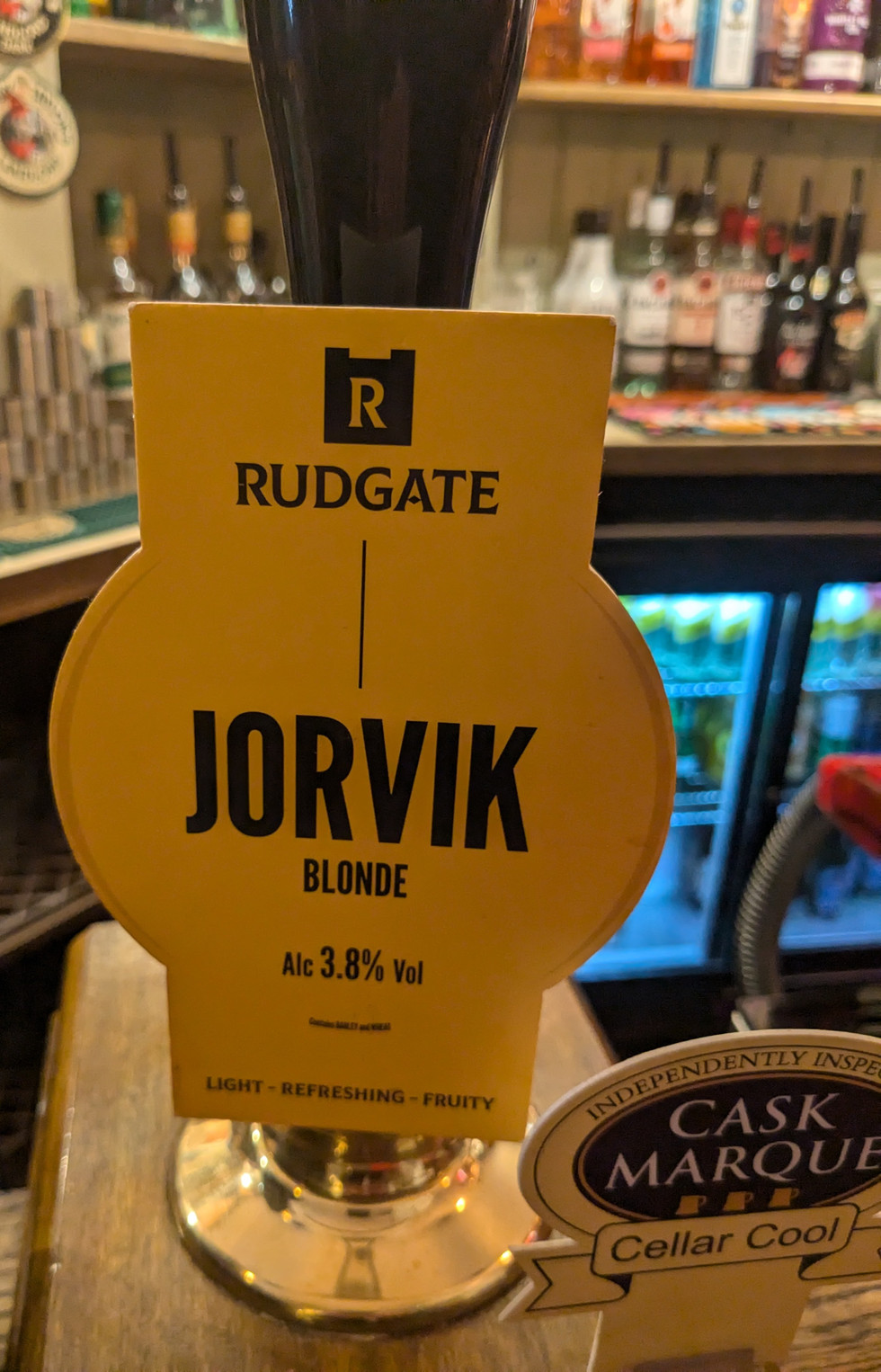 York. Originally a Medieval inn that housed many Royalist soldiers preparing for the Siege of York in 1644. It was demolished in 1730 and replaced by the current building, the pub being established in 1733. Tradition states that the body of highwayman Dick Turpin was kept in the cellar of the pub overnight after his execution in 1739, and that the landlord of the pub allowed patrons to see the body for a small fee. And of course it is claimed that his ghost haunts the pub. The entrance to the pub is through a narrow courtyard off of the main street. The bar is on the main floor and there are areas around the bar, large rooms upstairs, and a small space downstairs in the afore mentioned cellar. I grabbed a Jorvik Blonde Ale from Rudgate Brewery in York and headed downstairs to sip my beer next to Turpin's coffin (a pretty unique place to enjoy a beverage!)