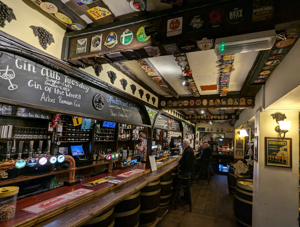 Gloucester. Located in a medieval building on St.Mary's Lane, it was originally part of the Golden Heart pub and was mostly an open courtyard in the 18th century. In the 1970s it was a wine bar called the Inner Court, reopened as Greyfriars in 1987, and became Cafe Rene in 1998. The pub contains an authentic Roman well that may have been used by the Franciscan friars who founded the nearby Greyfriars monastary in 1231. There are underground tunnels that connected the cathedral to other parts of the city used by the monks as escape routes, and during the Reformation Oliver Cromwell used them to evade the Cavaliers during the Civil War. It is reputed to have six ghosts and a poltergeist, including a monk, and elderly woman, and a ginger bearded man. Inside is a spacious area surrounding a long bar (check out all the wine bottles on the ceiling of the large dining room!). I enjoyed a Stumble Bee Ale from South Hams Brewery - the addition of a bit of Slokeley honey gave it a nice sweet and bitter flavor.