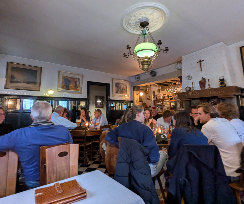Wortegem-Petegem, Belgium. This is pub that I am so fortunate to have visited. Were it not for my Belgian family I never would have had this fabulous experience. After a lovely lunch with the family and visiting the nearby Flanders Field American Cemetery in Weregem (where the kind attendant allowed us to go into the chapel), we arrived at this little gem of a pub. An agricultural distillery dating back to 1752, some say that it is where the origins of Wortegem lemon jenever lie. The owner/manager/brewer Gijs Dewilde is a dentist during the week and a wonderful host at this slice of beer heaven on the weekends. Upon entering, a cozy room welcomes you, and it was packed - this is definitely the place to be for the locals of all ages. There is a small room off to the side (filled with dozens of jugs from various Belgian breweries that were used by the brewers to bring flowers to their wives/lady friends), a room opposite the small bar, and another small room in the back. Outside behind the main building is a separate building decorated with more jugs, glasses, mugs, and all kinds of other beer memorabilia, and fantastic outdoor seating area under an old chestnut tree. And the beers - wow! Bottles (I believe about 200) from many great Belgian and French breweries, including the Trappist monastery Westvelteren, which is not seen often. Outside we shared a bottle of Anosteke from Brasserie du Pays Flamand in Merville France, a delicious strong blonde ale that won a gold award in the 2022 World Beer Cup. Then inside to the main room to enjoy the house beer Wildebras, a fantastic full bodied darkish blonde ale brewed with four varieties of hops from nearby Poperingse, giving it a great fruity and citrusy aroma. This was the culmination of a delightful day in Flanders (I hope I got most of this information correct - almost all by word of mouth and much Flemish!).