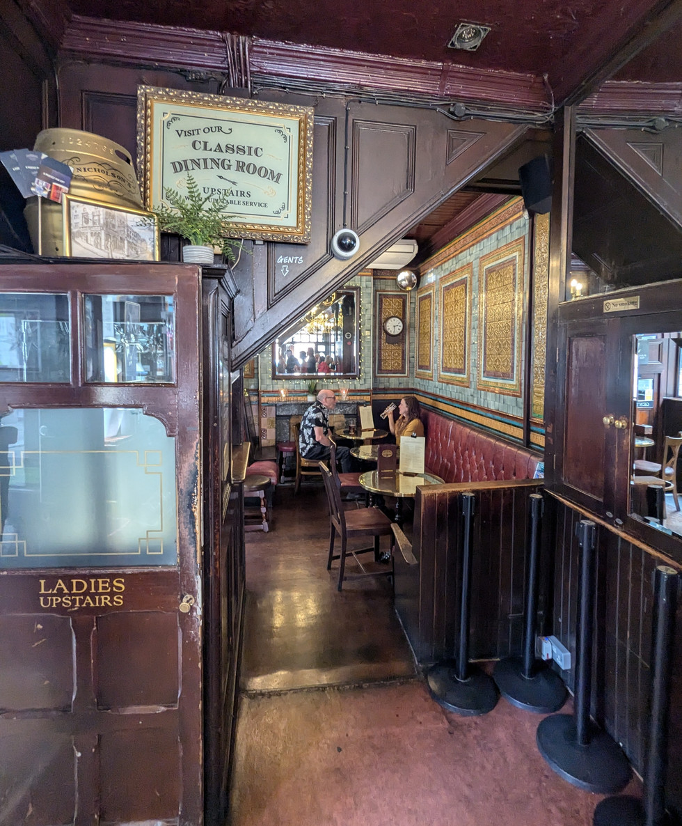 The interior shines with Victorian opulence with etched mirrors, glazed mirrors, and gold plated chandeliers. And I love the beautiful old dark wood bar. A Nicholson's pub, I enjoyed a pint of Fuller's London Pride.