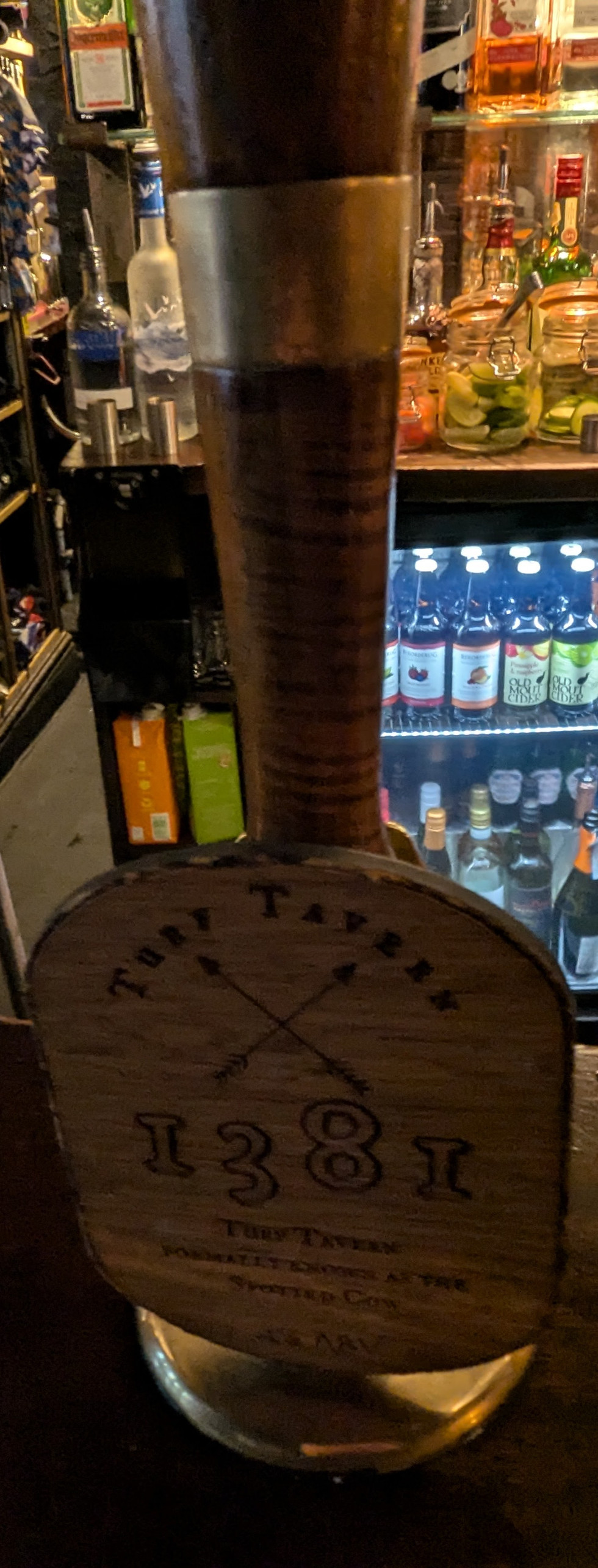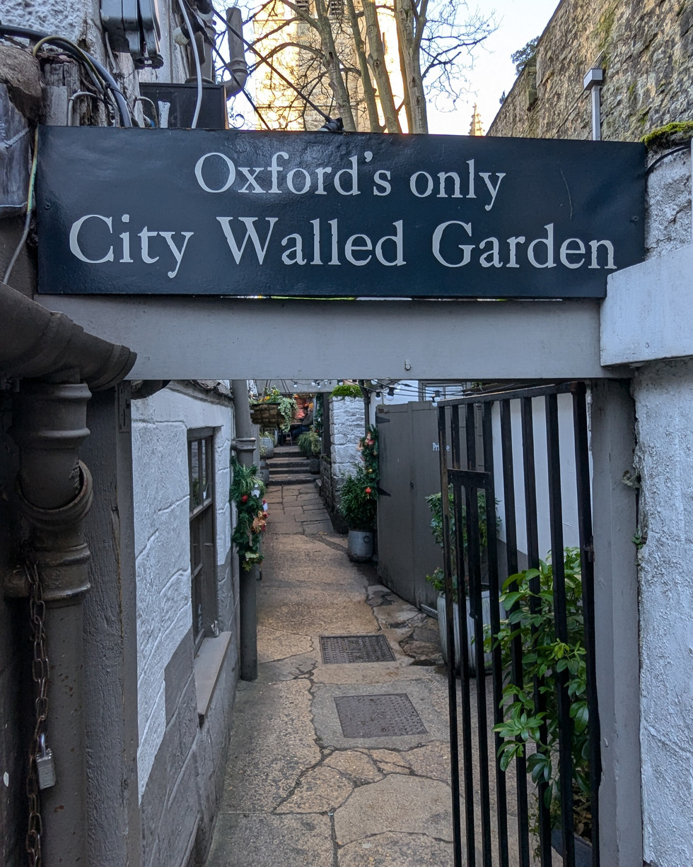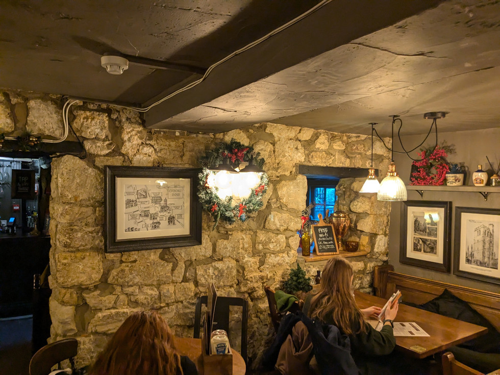 Oxford. The pub's foundations date back to 1381 when it was called the Spotted Cow, with the (very!) low beamed front bar area put in place in the 17th century. The name was changed in 1842 and comes from the turfmen (turf accountants/bookies) who used to take bets here. It is located in a narrow alley called St. Helens (formerly Hells) Passage near the Bridge of Sighs and one section of the old city wall runs a long one side of the pub (built outside the city wall to avoid the jurisdiction of local college governing bodies due to the illegal activities of its original patrons). Our tour guide said only criminals, prostitutes, and Cambridge graduates (ha!) would be seen here. Inside are a series of small rooms, and outside there is a spacious beer garden. There is a long list of famous people who have frequented the pub including Oscar Wilde, Thomas Hardy, Elizabeth Taylor and Richard Burton (who would meet here secretly before they were married), Stephen Hawking, CS Lewis, Margaret Thatcher, David Cameron, and Emma Watson (all students at Oxford, Emma Watson currently). Also the hangout of the cast and crew of the Harry Potter movies while filming in Oxford, and it has appeared in several episodes of Inspector Morse and Endeavor. Australian Prime Minister Bob Hawkes is said to have set the world record for downing a yard of ale in 11 seconds here (disputed). And Bill Clinton is said to "not have inhaled" here. I enjoyed a tasty Turf Tavern Ale brewed by Greene King and a delicious fish and chips. This must be on your pub list when you visit Oxford.